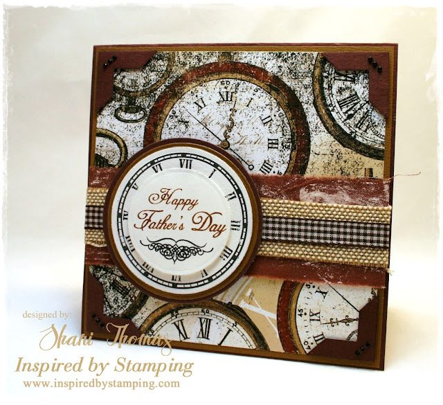 Clocks and time pieces are a trendy theme and the images can create a great background for that dependable man in your life. Shani Thomas created a detailed, time-honored card using images from Inspired by Stamping.