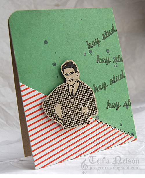 Tenia Nelson”s card below featuring a trendy retro guy from a Unity Stamp set had me grinning instantly. I swear someone from my office must have modeled for this stamp!