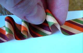 There”s an even easier method to create very simple waves of ribbon on your project. You can create ruffles using any type of ribbon on hand by simply gathering ribbon along a strip of strong adhesive, as shown in this example: