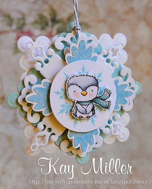 Love to layer? Create a wonderful snowflake shape ornament with your favorite cardstock, dies, and stamps. Kay Miller wins my unofficial “Snowflake Queen” designation with more than one of her projects shared today including this adorable penguin ornament. Multiple layers of Spellbinders snowflake cut outs and super cute stamp from Purple Onion Designs make this an instant favorite.